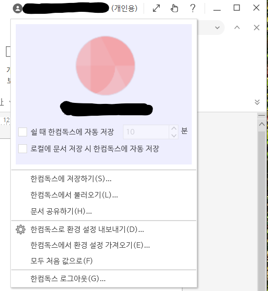 혹시 한컴독스 개시 이후로 한글2022가 어떻게 달라진 점이 있는지 확인하느라고 실행해 보았다. 화면 우측 상단에 등록된 이메일이 보이는데 그 부분을 눌러보니 위와 같은 화면이 추가로 나타나는데 '한컴독스'라는 용어로 바뀌었다.