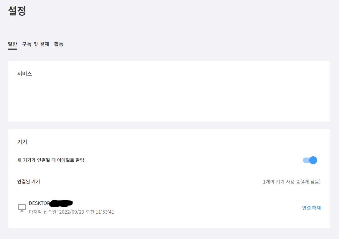 개인용은 다섯 대의 컴퓨터에 사용할 수 있고 위 화면에 보이는 것처럼 사용하지 않는 컴퓨터는 연결을 해제하면 되니 다른 컴퓨터에 새로 설치해서 쓸 수 있다.